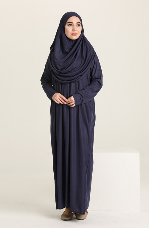 - Lacivert rengiyle şıklığı ve zarafeti bir arada sunan tek parça boydan giymeli kadın namaz elbisesi, günlük kullanım için idealdir.