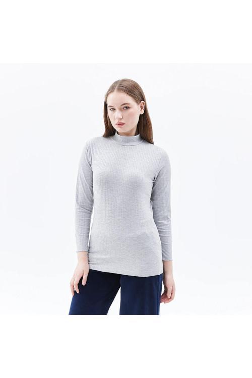 Defys Kadın Dik Yakalı Uzun Kollu Tişört Gri Melanj