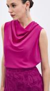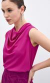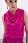 Degaje yaka, kolsuz, kalça boy, salaş şifon bluz.