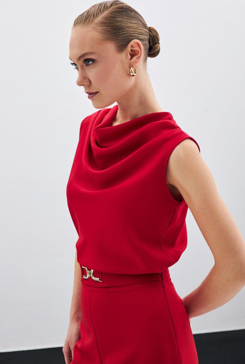 Degaje yaka, kolsuz, kalça boy, salaş şifon bluz.