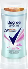 Degree Advanced Sheer Powder Antiperspirant Stick Deodorant, 72 saat boyunca ter ve kokuya karşı etkili koruma sağlar. Frezya, yasemin ve vanilyanın hafif ve tropikal kokusuyla gün boyu ferahlık sunar.