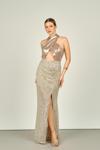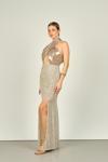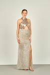 Detay: Sırt dekolteli, 2 parça görünümlü (ürün tek parçadır), etek kısmı pul payetli, astarlı abiye elbise;