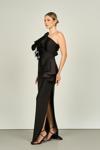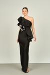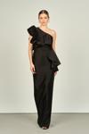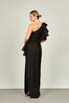 Detay: Belde seyyar gül detaylı, omuz ve bel volan detaylı, astarlı abiye elbise;