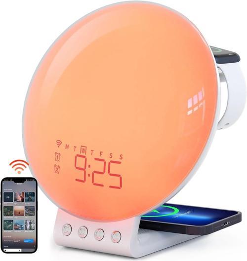 Dekala Smart Sunrise Alarm Clock with Wireless Charging for iPhone 14 13 12 Apple Watch AirPods Samsung, White Noise Sleep Sounds Machine, Nursery Night Light for heavy sleeper kid Touch & App Control