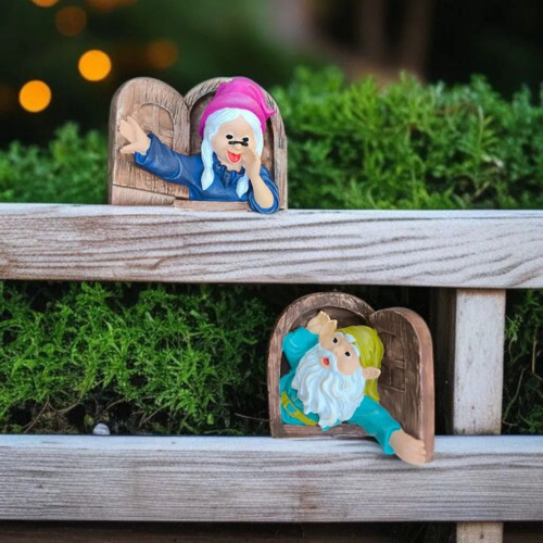 Pencereden bakıyormuş gibi duran cüce figürleri, bahçe dekorasyonuna sıcak ve doğal bir hava kazandırır.