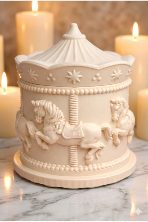 Zarif carousel (atlıkarınca) tasarımıyla öne çıkan bu dekoratif ürün, hem takı organizeri hem de mumluk olarak kullanılabilecek şekilde tasarlanmıştır.