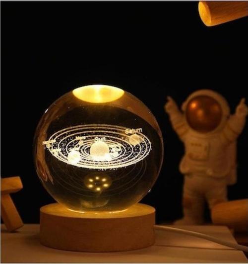 Kesene Ledli USB'li Ahşap Standlı Güneş Sistemi Temalı Kristal Küre Gün Işığı 3D Oda Masa ve Gece Lambası