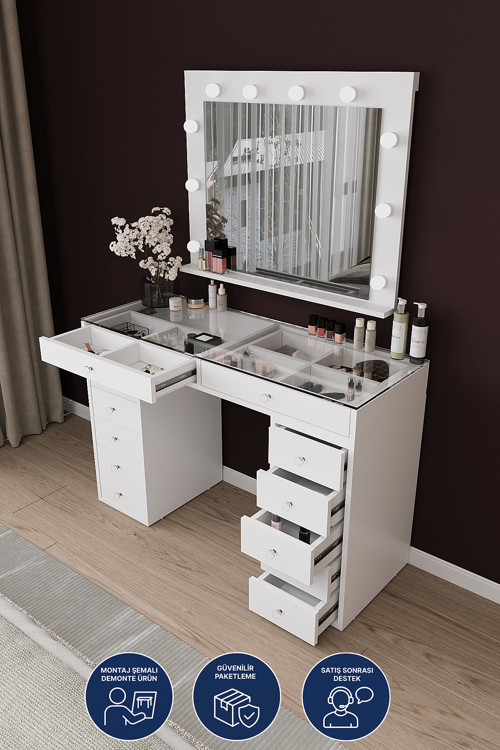 Üst kısımda yer alan şeffaf kapaklı bölmeli çekmeceler, makyaj malzemelerinizi düzenli biçimde saklamanıza yardımcı olur. Alt kısımdaki çift taraflı toplam 10 adet çekmece, parfüm, cilt bakım ürünleri, aksesuar ve kişisel eşyalar için geniş depolama alanı sunar.