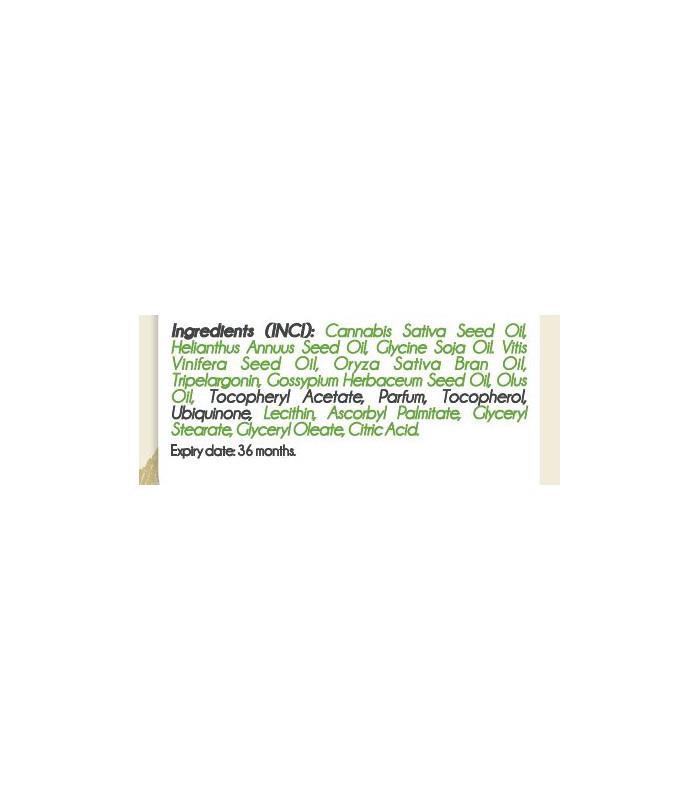 Aktif bileşenler :% 50 kenevir yağı, koenzim Q10 ve E vitamini, zengin yağlar: üzüm çekirdeği, soya fasulyesi, pamuk, pirinç, ayçiçeğinden.