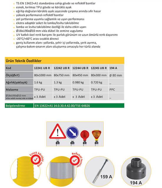 Delinatör 100 x 8 cm Sarı 5 Adet, Esnek Duba; uygun maliyetli işlevsel bir trafik güvenlik ekipmanıdır. Otopark girişleri, nizamiyeler, yol çalışmaları, geçici veya kalıcı alan kapatmalarında kolay ve ekonomik bir çözüm sunar. Trafiğin yoğun olduğu yollarda sürücüleri uyarmak amaçlı, şerit ayırıcı, yönlendirici, şerit düzenleyici olarak kullanılır. Delinatörün yapısı esnek, darbelere ve hava koşullarına dayanıklıdır. Gece görüşünü artırmak için delinatörler reflektif malzeme ile kaplıdır. İstendiğinde vida ile yere sabitlenebilir.Delinatör ile birlikte 3 tane dübel+vida+pul dan oluşan montaj ekipmanı ile birlikte set halinde sevk edilmektedir.