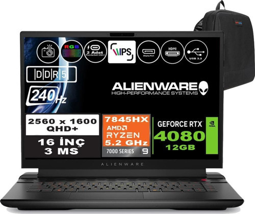 Dell Alienware M16 R1 Amd Ryzen 9 7845HX 64GB Ddr5 1tb SSD RTX4080-12GB 16 Inç 240Hz Qhd+ Windows 11 Home Gaming Laptop AWM16AMDR9HX80WH04 + Zetta Çanta
