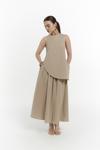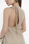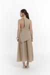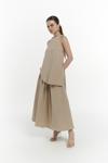 Boyundan bağlamalı, halter yaka kolsuz bluz. Asimetrik katlı kesim.