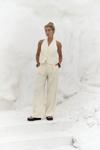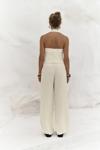 Yüksek belli, palazzo pantolon. Ön pilili yapısıyla hacim kazanır. Yan ceplidir. Astarsızdır. Fermuar ve düğme kapamalı.