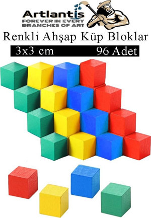 Artlantis Renkli Ahşap Küp Bloklar 3x3x3 cm 96 Adet Ahşap Renkli Kare Blok Eğitici Geliştirici Oyuncak Küp Matematik Birim Küpleri