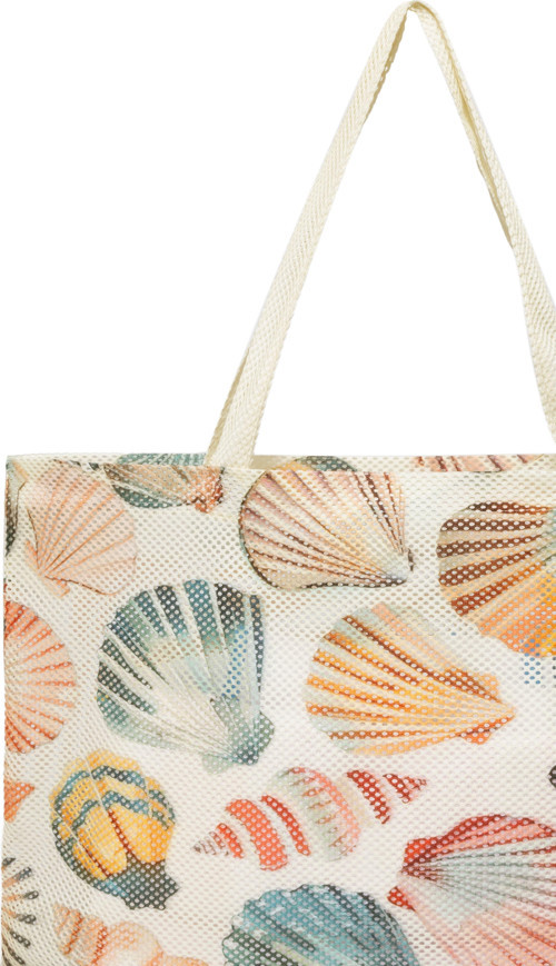Deniz kabuğu desenleriyle süslenmiş, plaj modasına uygun şık bir tasarım.