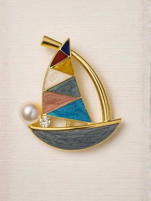 Yelkenli tekne figürlü broş, deniz temalı tasarımı ve zarif taş detaylarıyla şık ve dikkat çekici bir kadın aksesuarıdır. Altın tonlu gövdesi ve mavi tonlarda taş işlemeleriyle tasarlanan bu yelkenli broş, yaz kombinlerine ve günlük kullanıma ferah bir dokunuş katar. Deniz, seyahat ve özgürlük temalı aksesuarları sevenler için özel bir tasarım sunar.