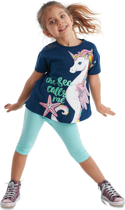 2 parça kız çocuk tunik ve tayt takım. Lacivert oval kesim, üzeri denizatı unicorn baskılı tunik ve mint mavi tayt.