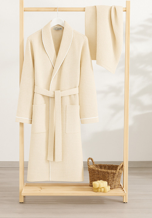 Soho Pike Bornoz + Havlu Seti, hafif ve nefes alan pike dokuması, yumuşacık tutumu ve yüksek nem emiciliğiyle banyo sonrası ferahlığı şıklıkla buluşturur.