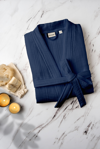 Müslin bornoz 1. kalite %100 pamuk ipliğinden üretilmiştir. Yıkama işlemi yapılmıştır ve yıkandıkça yumuşaklığını koruyacaktır. Efektli bir görünüme sahiptir. Kumaş nefes alabilen bir yapıda olduğu için banyo sonrası yüksek nem emiciliğine sahiptir ve hızlı kurur.