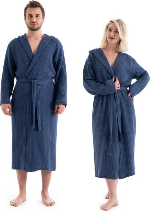 Denizli Concept Unisex Lacivert Kapşonlu Bornoz - 4 Kat Müslin, Rahat Ve Şık