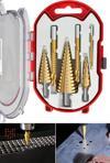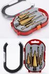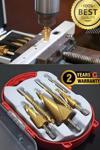 - Delik delme ve pah açma işlemleri için ideal, 6 parçadan oluşan set halinde sunulan delik delme pah açma kademeli delme panç seti.