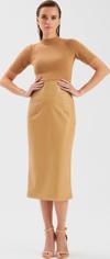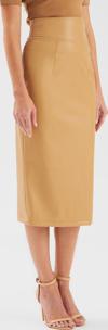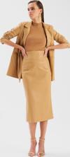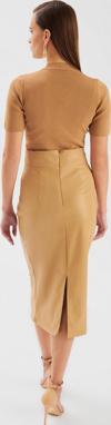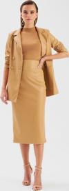 Yüksek bel, arka fermuarlı ve yırtmaçlı, midi boy, şardonlu, deri kalem etek.