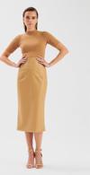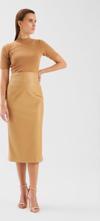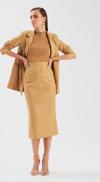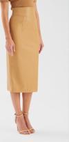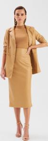 Yüksek bel, arka fermuarlı ve yırtmaçlı, midi boy, şardonlu, deri kalem etek.