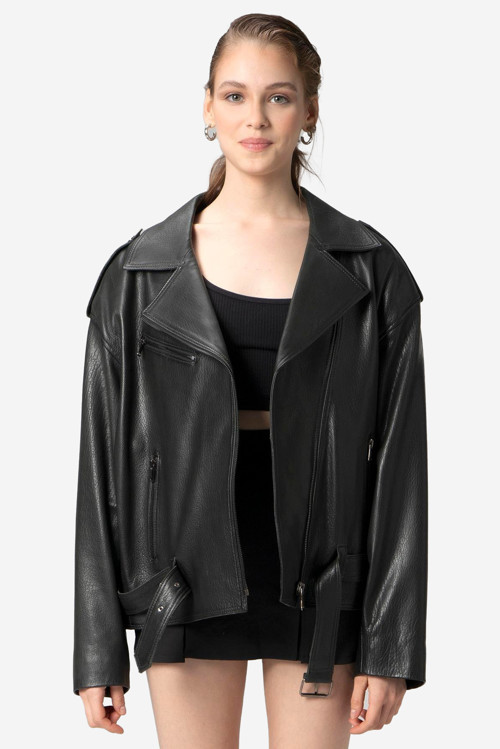 * Kendine özgün tarzıyla dikkatleri üzerine çeken model , jumbo deri kalitesi ile ön plana çıkıyor. Oversize kalıba sahip bu mont, farklı yerlere konumlandırılan fermuar detaylara ve bel kemerine sahip. Düşük omuz tasarımı ve omuz apoletleriyle oldukça sportif bir görünüm kazanmıştır.