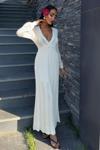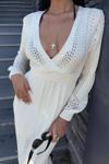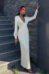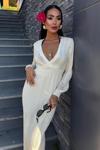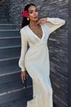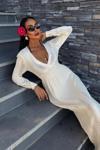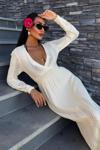 Ekru rengiyle zarif bir görünüm sunan derin yaka triko elbise, günlük kullanım için idealdir.