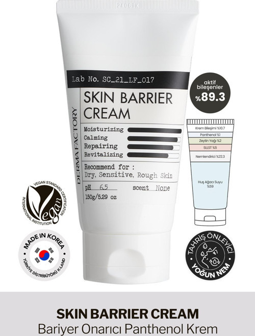 BİLGİLENDİRME: DERMA FACTORY MARKASININ ÜRÜNLERİNİN ÇOĞUNDA DIŞ KUTU BULUNMAMAKTADIR. BU, MARKANIN KENDİ POLİTİKASIDIR. DIŞ KUTU MALİYETİNİ ORTADAN KALDIRARAK SADE AMBALAJLAR İLE ORTAYA ÇIKAN MARKA, AMBALAJ VE KUTU RENKLERİ, TASARIMI İLE DEĞİL, İÇERİK VE KALİTESİ İLE ÖNE ÇIKMAYI AMAÇLAYARAK KUTU MALİYETİNİ VE KAĞIT ATIĞI EN AZA İNDİRMEK ADINA ÜRÜNLERİ KUTUSUZ FAKAT KORUMA BANTLI OLARAK ÜRETMEKTEDİR. RESMİ KORE SAYFASINDA ÜRÜNLERİN HER PARÇASININ GERİ DÖNÜŞÜMÜNE DAİR BİLGİLER DE BULUNMAKTADIR. Cilt bariyerini güçlendirmek için cilt lipitlerine benzerbir bileşen olan %5 SLLST tm içeren yüksek düzeyde nemlendirici bariyer kremi.