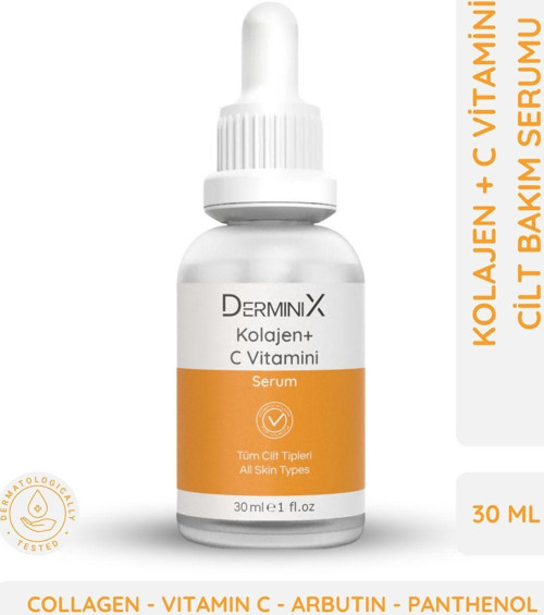 Derminix Kolajen + C Vitamini Serum Cildi yenileyerek aynı zamanda beslemeyi hedefleyen bu serum, içeriğindeki güçlü antioksidanların sinerjik etkisiyle leke oluşumunu baskılayarak cilt lekeleri konusunda hassas bir bakım sunar. Özellikle donuk ciltler, cilt tonu eşitsizliği yaşayan ciltler ve yaşlanma karşıtı bakım ihtiyacı olan ciltler için uygundur. Serum, ince kırışıklıkların azalmasına ve cildin parlak ve gergin bir görünüm kazanmasına yardımcı olur. İçeriğinde bulunan kolajen, ince kırışıklıkların azalmasına ve cildin parlaklığının artmasına destek olurken, C vitamini mükemmel bir antioksidan olarak kolajen sentezini artırır, cilt tonunu eşitler ve yaşlılık lekelerinin azalmasına yardımcı olur. Arbutin, ciltte fazla melanin üretimini engelleyerek güneş, yaşlanma ve akne gibi nedenlerle ortaya çıkan koyu lekelerin önüne geçmeye yardımcı olur. Panthenol (B5 vitamini), cildi nemlendirir ve nemi ciltte tutmaya yardımcı olur. E vitamini cilt kuruluğu, kırışıklıklar ve güneş hasarı gibi cilt problemlerinin üstesinden gelmeyi kolaylaştırır. Hyaluronic asit, cildin elastikiyetini korur ve cildi pürüzsüzleştirir, aynı zamanda doğal bir antioksidan özelliği sunar. Kullanımı oldukça basittir