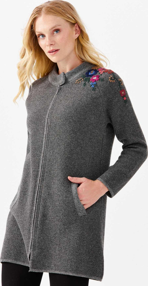 Detay: Omzu işlemeli, uzun kollu, dik yaka hırka;