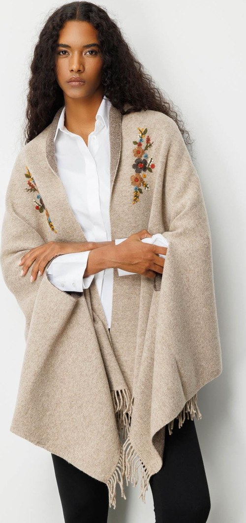 Kadın Yakası İşlemeli Koldan Geçmeli Büyük Yün Panço 25060 Bej