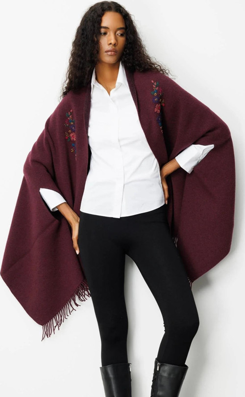 Kadın Yakası İşlemeli Koldan Geçmeli Büyük Yün Panço 25060 K.Mürdüm