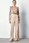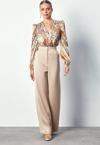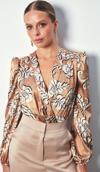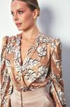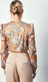 Kruvaze, vatkalı, balon lastikli kol, bel lastikli, altan çıtçıtlı, desenli bodysuit bluz.