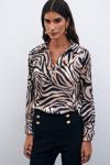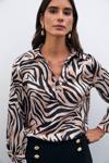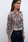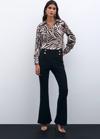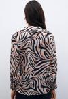 Gömlek yaka, geniş manşetli uzun kol, desenli salaş bluz.