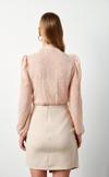 Kruvaze yaka, balon lastikli kol, bel lastikli, iç birleşik ip askılı astarlı, altan çıtçıtlı, kendinden desenli bodysuit bluz.