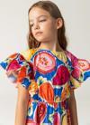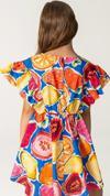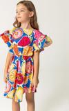 Yüzde yüz pamuklu, meyve desenli ve renkli bu kısa kız çocuk yaz elbisesi, hem rahat hem de eğlenceli bir tasarımsunuyor. Omuzlara doğru uzanan fırfır detayları, hafif bir kol ve omuz kapama sağlarken, ensesindeki düğme ile kolay giyim imkanı sunuyor. Asimetrik kesimiyle modern bir tarz kazanan bu elbise, yazın vazgeçilmez bir parçası olacak