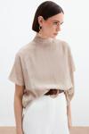 Dik yaka, düşük omuz, kısa geniş kol, arka yaka düğmeli kapama, kalça altı boy, desenli salaş bluz.