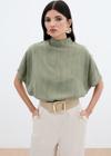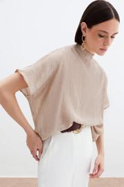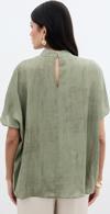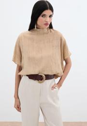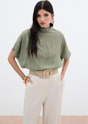 Dik yaka, düşük omuz, kısa geniş kol, arka yaka düğmeli kapama, kalça altı boy, desenli salaş bluz.