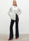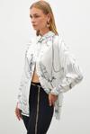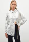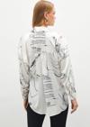 Ön gizli pat, düşük omuz, geniş manşetli uzun kol, kalça altı boy, desenli salaş gömlek.