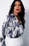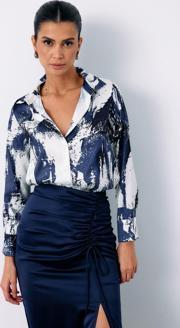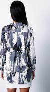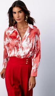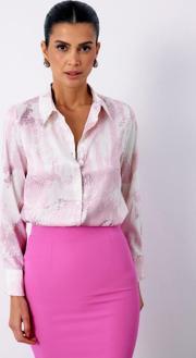 Ön düğmeli, ince manşet uzun kol, yanlar mini yırtmaçlı, kendinden desenli salaş gömlek.
