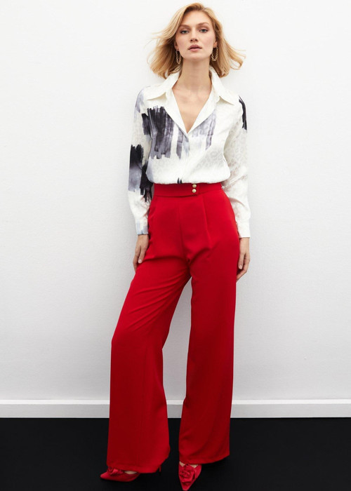 Ön gizli patlı, kalça altı boy, uzun düğmeli kol, kendinden desenli salaş gömlek.