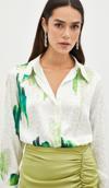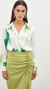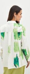 Ön gizli patlı, kalça altı boy, uzun düğmeli kol, kendinden desenli salaş gömlek.