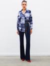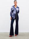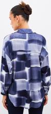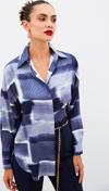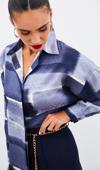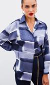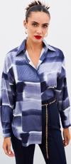 Ön gizli pat, manşetli düşük omuzlu kol, yanlar mini yırtmaçlı, kalça altı boy, desenli uzun salaş gömlek.