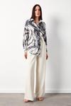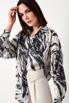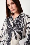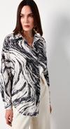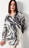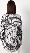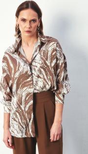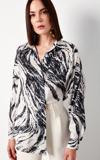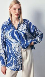 Ön gizli pat, yanlar mini yırtmaçlı, düşük omuz, arkası uzun, desenli uzun gömlek.
