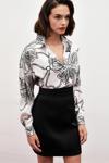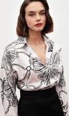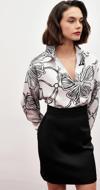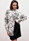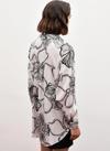 Ön gizli patlı, düşük omuz, uzun salaş kol, kalça altı boy, desenli uzun gömlek.