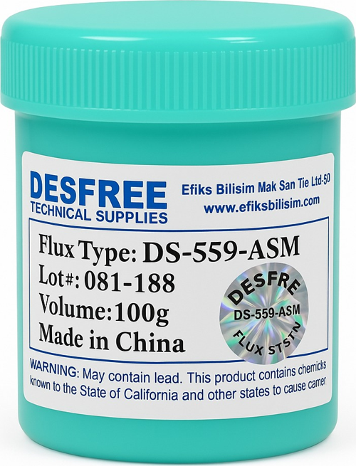 DESFREE DS-559-ASM Flux Krem 100G – Genel Özellikler DESFREE DS-559-ASM, ısıl işlem sonrası şeffaf ve katı bir yapı alarak yüzeyde kalıntı bırakmadan temiz bir lehim sonucu sağlar. 183°C - 376°C arası yüksek sıcaklıklarda, lehim alaşımlarının oran ve yapısını bozmadan mükemmel lehimleme performansı sunar. Yüksek ısı altında bile özelliğini uzun süre korur ve akışkanlığını kaybetmez. Yeni nesil ROL0 sınıflandırmasına sahiptir. İşlem sırasında ani yanma veya kararma yapmaz. Özellikle uzun süreli BGA işlemlerinde yüksek verim sağlar. Lehim Alaşımlarına Göre Reaksiyon Sıcaklık Aralıkları Lehim Tipi Alaşım En İyi Tepkime Sıcaklığı %63 SN / %37 PB Standart kurşunlu lehim 183°C - 261°C %60 SN / %40 PB Yüksek kurşun oranlı lehim 183°C - 376°C Temizleme Gerektirmez İşlem sonrası kalan flux şeffaf ve katı hale geçer. 0 iletkenlik değerine ulaştığı için kart üzerinde kalabilir, ekstra temizleme gerekmez. Kullanım Alanları Cep telefonu, laptop, tablet ve notebook tamirlerinde Chipset ve anakart onarımlarında Reballing (BGA top yenileme) işlemlerinde BGA / SMD Rework cihazları ile yapılan elektronik parça değişimlerinde DESFREE DS-559-ASM, lehim noktalarının yeniden iletken hale gelmesini sağlar ve zamanla temas kaybeden bacakların onarılmasında kritik rol oynar.
