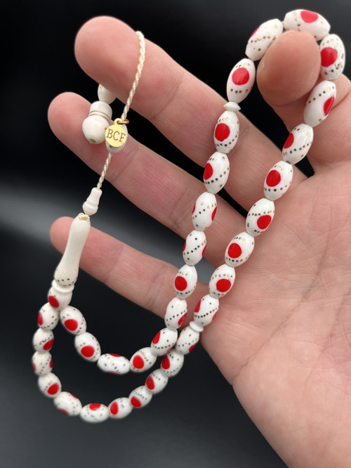 Bu tesbih, beyaz deve kemiği malzemesi ve arpa kesim habbeleriyle öne çıkar. Zarif tasarımı ve doğal malzemesiyle dikkat çeker.