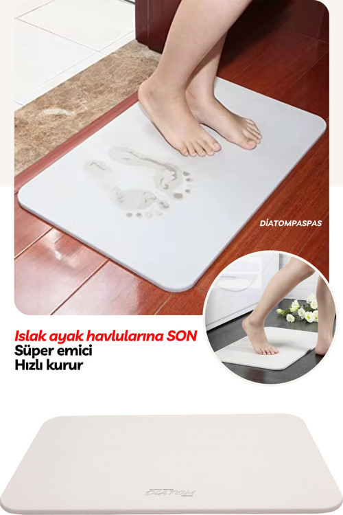 *60 9MM Kalınlığındadır. Diatompaspas KLASİK TEKSTİL ürünü bir paspas DEĞİLDİR. Diatompaspas , diatomit toprağın yüksek emicilik özelliğinden faydalanılarak tasarlanmış bir paspastır. Banyo,Duşakabin, Küvet ve Lavoba önlerinde oluşan ıslaklıklara kesin çözüm olması için üretilmiştir. Yapısı itibaren eğilip bükülemez, kolay kolay kırılmaz, dokusu ağaç parke sertliğinde denebilir. Diatompaspas üzerinde ayağınız kesinlikle kaymaz. Diatompaspası kulllandığınız andan itibaren sık sık değiştirmek ve yıkamak zorunda kaldığınız ayak havlusu kullanmanıza gerek kalmayacaktır. Lavabo ve duşakabin önlerinde oluşsan ıslaklıklara kesin çözümü bulacaksınız. Özellikle Lavabolarda abdest alınan evlerde sık sık oluşan ıslaklara artık son verecektir. Geleneksel ayak havlu ve paspaslarla karşılaştırıldığında, Olağanüstü emicidir,